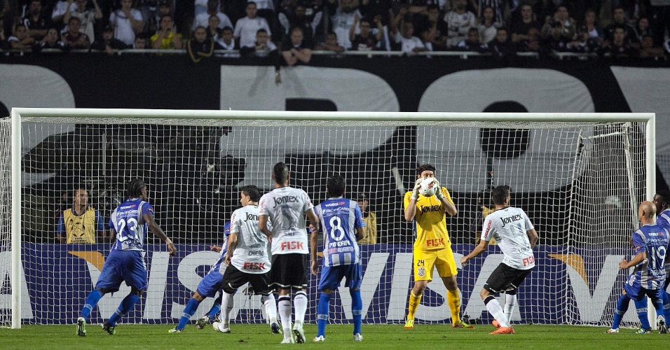 Goleiro Cássio agarra a bola após lance ofensivo do Emelec, em partida no Pacaembu, pela Libertadores